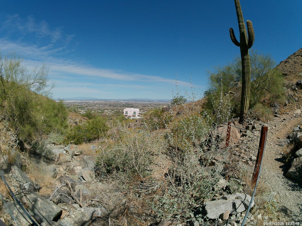 From here, the trail winds up and down the high slopes on the north side for a mile or so before cresting again. On the way, you can see the farming village of Laveen and the gated communities that increasing surround it. You can also absolutely win a game of desert cactus bingo along its slopes, passing stately saguaros, whispey ocotillos, stunted palo -verde trees, angry cholla and in the right season delicate wildflowers. If you’re lucky you’ll see some hawks. If you’re less lucky – jet planes.