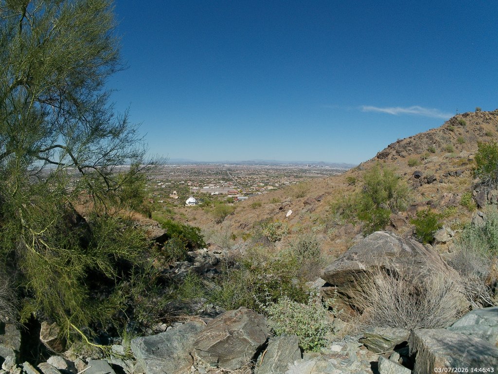 Upper Holbert continues past the Dobbins junction, climbing the rest of the way out of the canyon before crossing Buena Vista Road. It keeps climbing over and then on top of the actual mountain. This portion is quieter, less crowded, slightly easier and more scenic than the portions that came before, and totally worth doing. In less than a half mile from Buena Vista Road, you will reach TV Road. Across that road – which goes to the antenna farm on the summit and the Gila Valley Lookout – is the terminus of the Holbert Trail as it T’s with the Maricopa or National Tail. You are at the 2.5 or 3 mile mark, depending on whether you went up to Dobbins, and have climbed at least 1200 feet from the trailhead to stand at 2400 feet above sea level.
