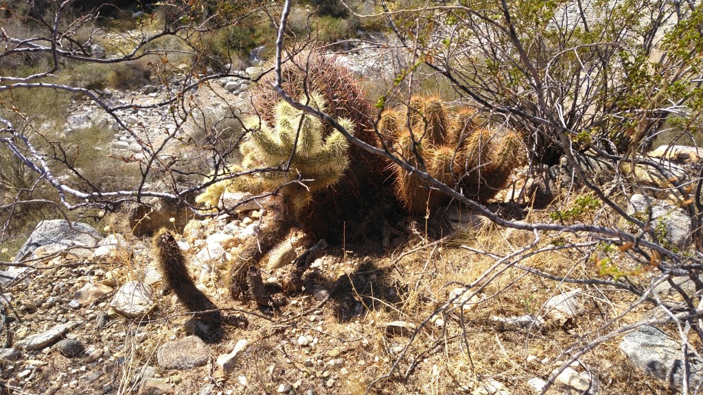 I took the Bajada Trail, of course. It promptly crossed the grey-gravel expanse of the main San Juan wash, and then began a lesser climb up the mountain, turning east kinda-sorta along the top of the bajada.