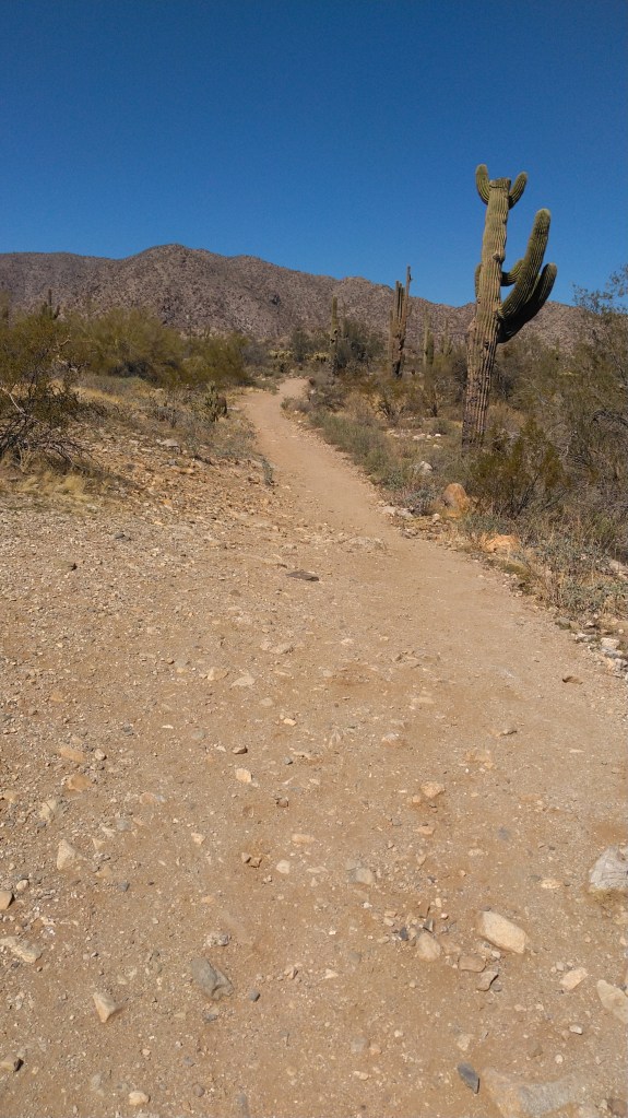 The trail will go up the berm and down the wash and up the berm for most of its remaining length (either direction). It is in excellent shape, a little rocky in places, blue and black basalt with a little gypsum for color, but you can do this in tennis shoes. The entire length is a shadeless march through stunted palo-verde trees, bone dry creosote and a scattering of cacti.