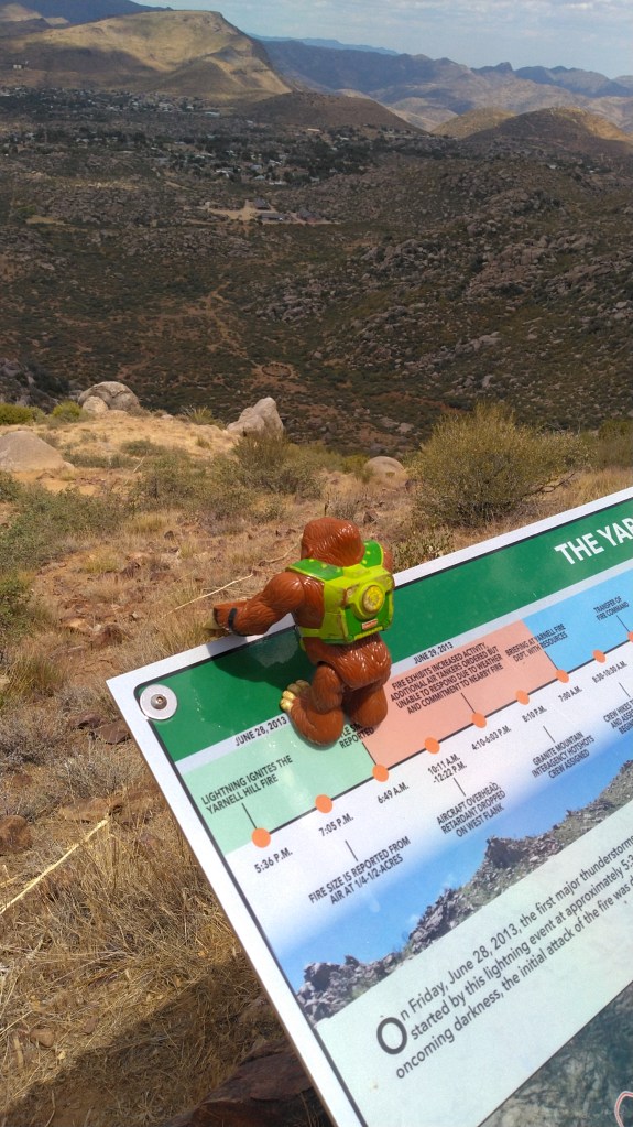 The Hotshot Trail ends at an Observation Deck overlooking the site where the 19 men actually burned to death. A large plastic plaque explains how that happened. There is a bench and shade and a tribute wall decorated with a multitude of firefighter patches along with other mementos.