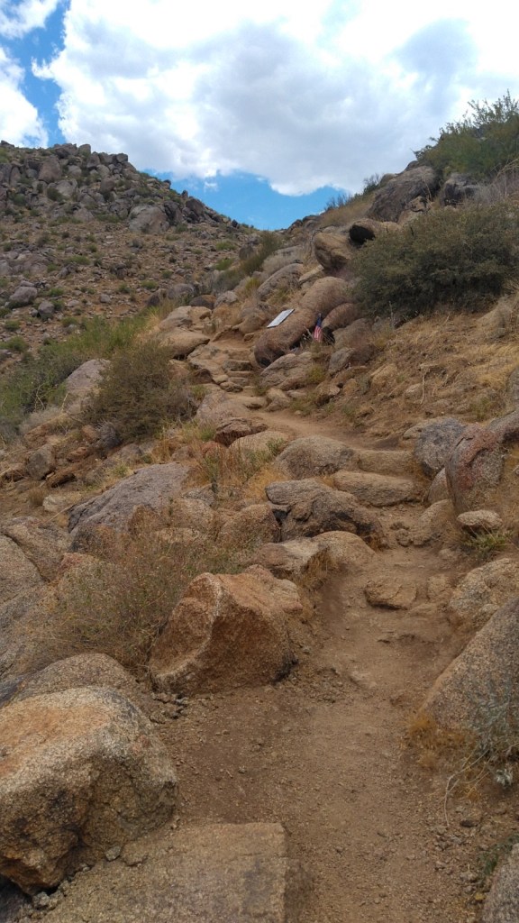 The main trail is just shy of three miles one way winding up and around the desert ridges. You can expect all the low desert hazards and all the low desert heat. The grade is gentle but constant as the packed dirt path switches back and forth across the ridge, perhaps more times than is really needed. On occasion, stone stairs will help you up or down.