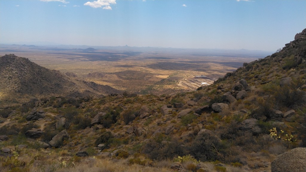As late as 2015, this small parking lot, complete with a remnant CCC ramada, was reachable by vehicle whenever the park was open. In the day, this was primarily trailhead parking for three main trails: The National or Maricopa trail, the Bajada Trail, and the Alta Trail. To the east, you can see downtown Phoenix through the saddle, but there are honestly better views elsewhere. To the west you could see the still undeveloped farms and deserts separating the South Mountains from the Estrella range.