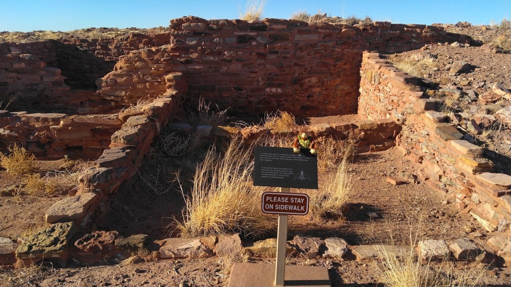 Ancestral Hopi took the trouble to destroy their homes, particularly ceremonial sites, as they abandoned them. Vandals and looters also did their share of damage. Unlike the towering ruins at say Wupatki or Walnut Canyon, all the average eye will see is a pile of rubble of what was once a sizeable complex of structures. Except for the small portion the state park excavated so I could pose my plastic gorilla in front of them and take pictures.