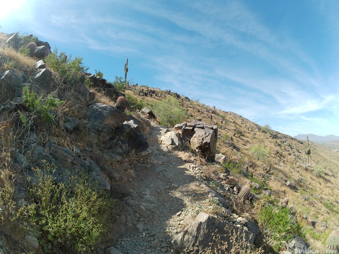 For the next three quarters of a mile, it is also easy single track across the top of the range wih all of Phoenix to your left (north) and the San Juan Valley, and the Gila range beyond to your right (south). Take you time here. This is the good part.